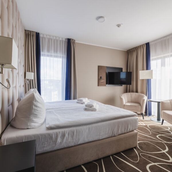 Nasze klimatyczne pokoje zostały zaprojektowane z myślą o wygodzie i spokojnym wypoczynku. Każdy pokój wyposażony jest w komfortowe łóżka, telewizor z płaskim ekranem, minibar, sejf oraz przestronną łazienkę. Większość pokoi posiada balkon lub taras, skąd można podziwiać malownicze widoki.